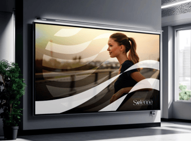 Nesta etapa, podemos visualizar a concretização futura da identidade visual da Solenne em diversos pontos de contato. É um processo de validação crucial, onde confirmamos a funcionalidade e o impacto do design em cenários reais, desde a fachada da clínica até o material de escritório e a presença digital.