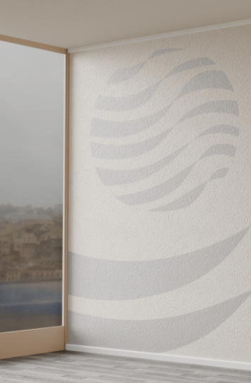 O logotipo e o grafismo de apoio são aplicados em sinalizações, na recepção e em elementos decorativos, criando um ambiente coeso e convidativo que reflete a sofisticação e o acolhimento da marca.