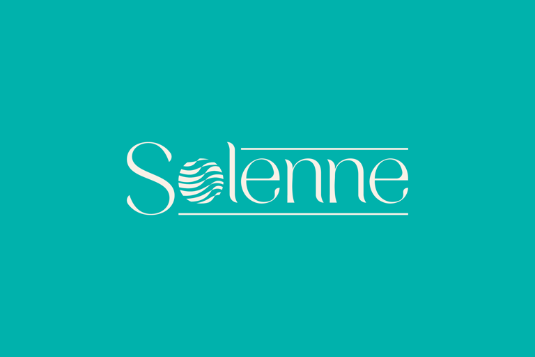Para a Solenne, o esboço vencedor integrou o elemento ondulado dentro do "O" da tipografia, garantindo que o logotipo fosse memorável e funcional em todos os formatos necessários, especialmente em reduções para perfis de redes sociais.